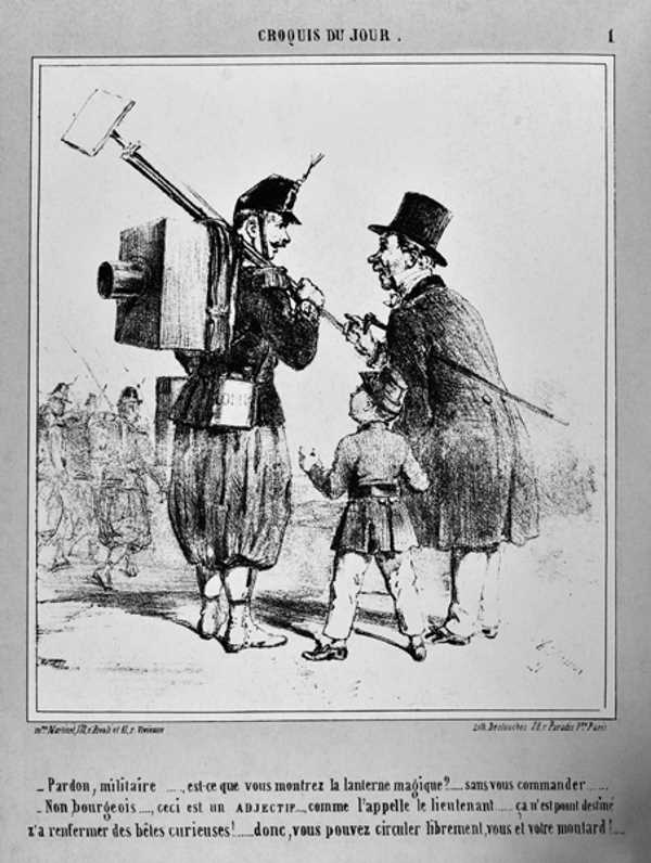 Dalla serie “Croquis du jour”, sulla rivista Charivari del 15 giugno 1861. La satira deride il soldato che si si sente importante perché dotato di una delle prime fotocamere dell’epoca. “Scusi, signor soldato… non per molestarla… ma ci fa vedere la lanterna magica?” “Nient’affatto, cittadino… questo è un aggettivo (gioco di parole con “obiettivo”, l’autore…