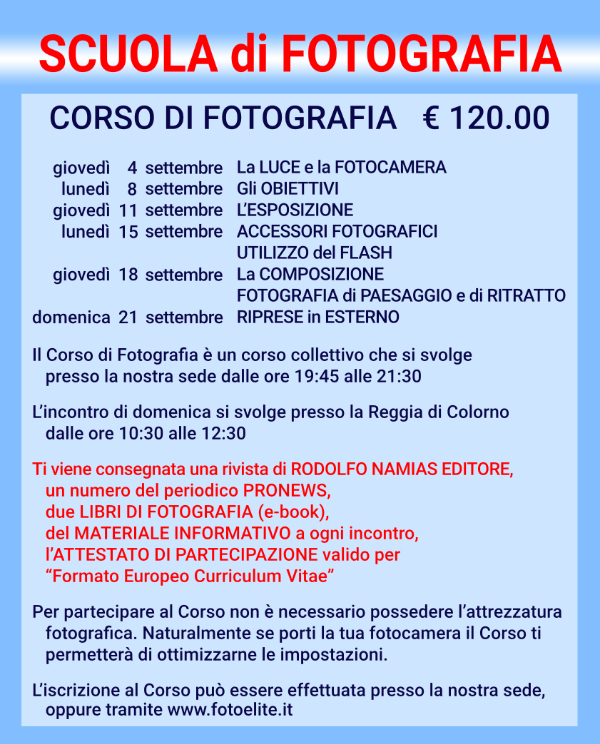 Per partecipare al Corso non è necessario possedere l’attrezzatura fotografica.