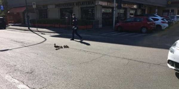 In questo caso gli agenti “scortano” mamma e anatroccoli che ritornano all’argine del fiume Bisenzio.