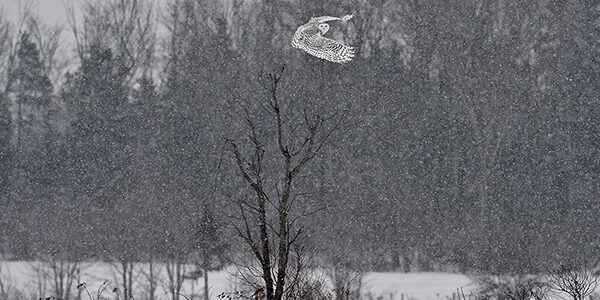 Sospeso nel cielo tra i fiocchi di neve come fosse appeso a un filo, stagliato sul nero degli alberi spogli, un gufo delle nevi fissa il fotografo, regalandogli uno scatto memorabile e poetico, da premio.
