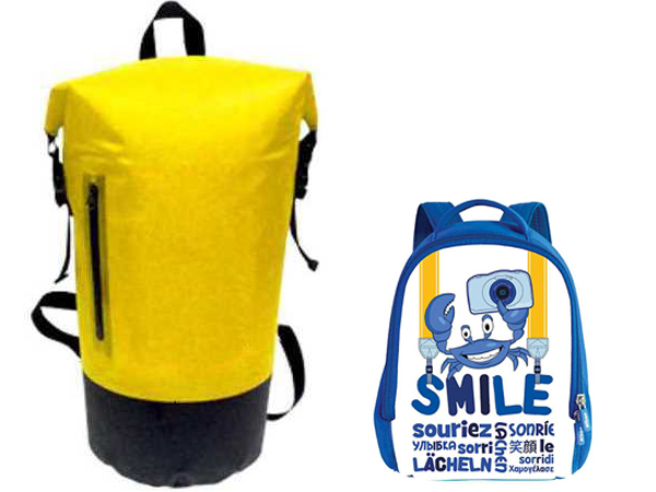 Puoi scegliere uno zaino piccolo con tasca interna per la fotocamera, oppure uno zaino grande (20 litri) con tasca esterna impermeabile per la fotocamera, e l’interno per telo mare e attrezzatura sub (pinne, maschera, ecc.).