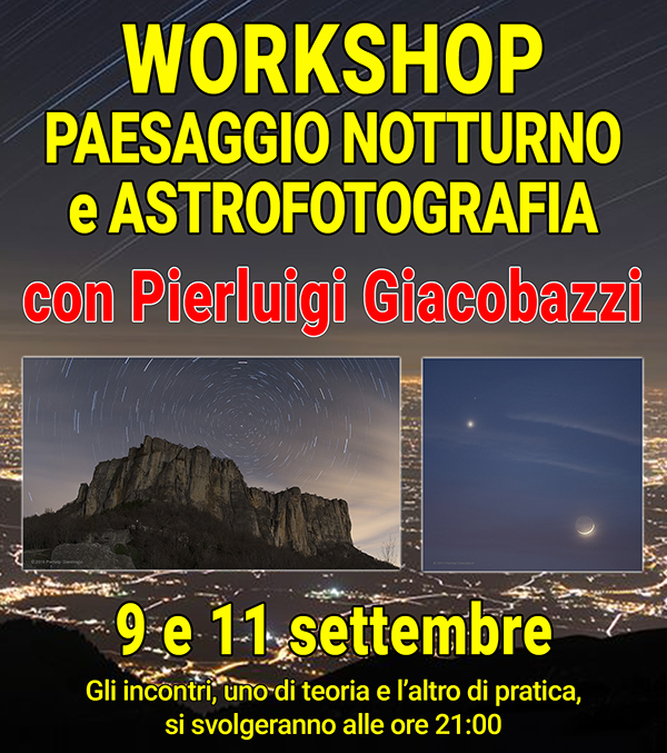 DettagliLa FOTOGRAFIA DEL PAESAGGIO NOTTURNO e la FOTOGRAFIA ASTRONOMICA con PIERLUIGI GIACOBAZZI, astrofotografo, divulgatore scientifico e guida ambientale escursionistica.Scopriremo le tecniche più moderne per la fotografia del cielo: le impostazioni ideali per la fotografia del tramonto e dell’alba, dei tracciati stellari (startrails), dei panorami notturni comprendenti le costellazioni e la Via Lattea.Giovedì 9 settembre dalle…