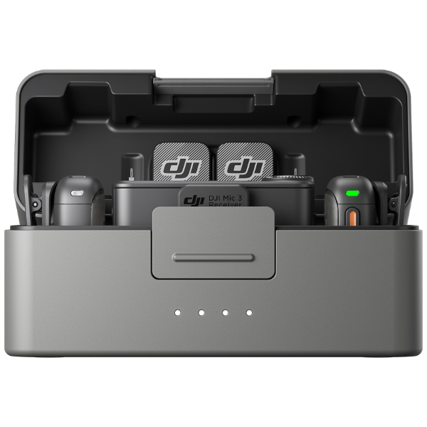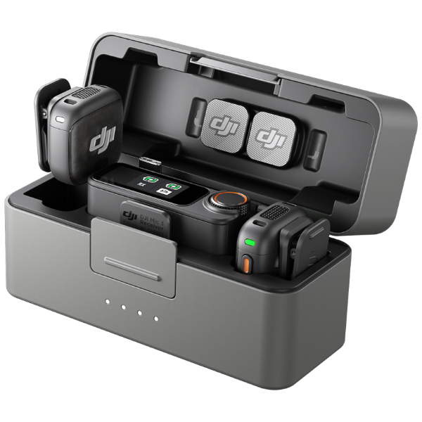 Kit di microfono wireless composto da due trasmettitori, un ricevitore e la custodia di ricarica